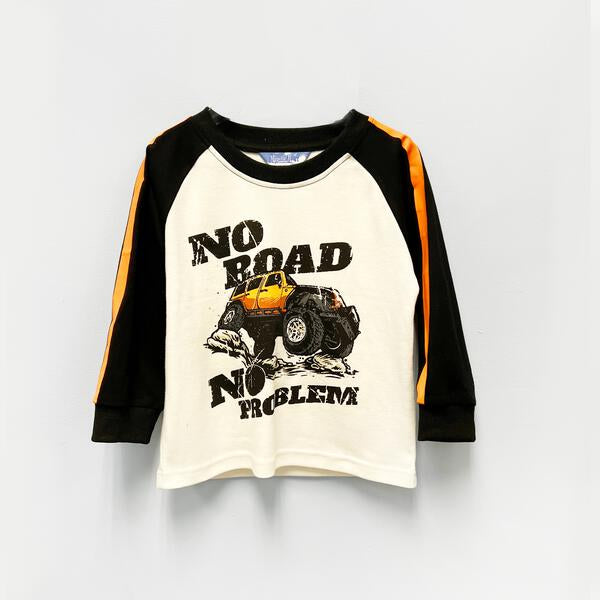 Let your little guy conquer any terrain with our Boys' "No Road No Problem" Off-Road Truck Raglan Long Sleeve Top—a bold, adventurous piece that blends rugged style with kid-friendly comfort. The cream-colored body features a striking graphic of a yellow off-road truck tackling rough terrain, paired with the empowering phrase “NO ROAD NO PROBLEM” in a distressed, rugged font. The black raglan sleeves are accented with bright orange stripes along the sides, adding a sporty, dynamic touch that feels both tough and modern. This top isn’t just clothing—it’s a wearable declaration of adventure, perfect for little explorers who love to push boundaries.
