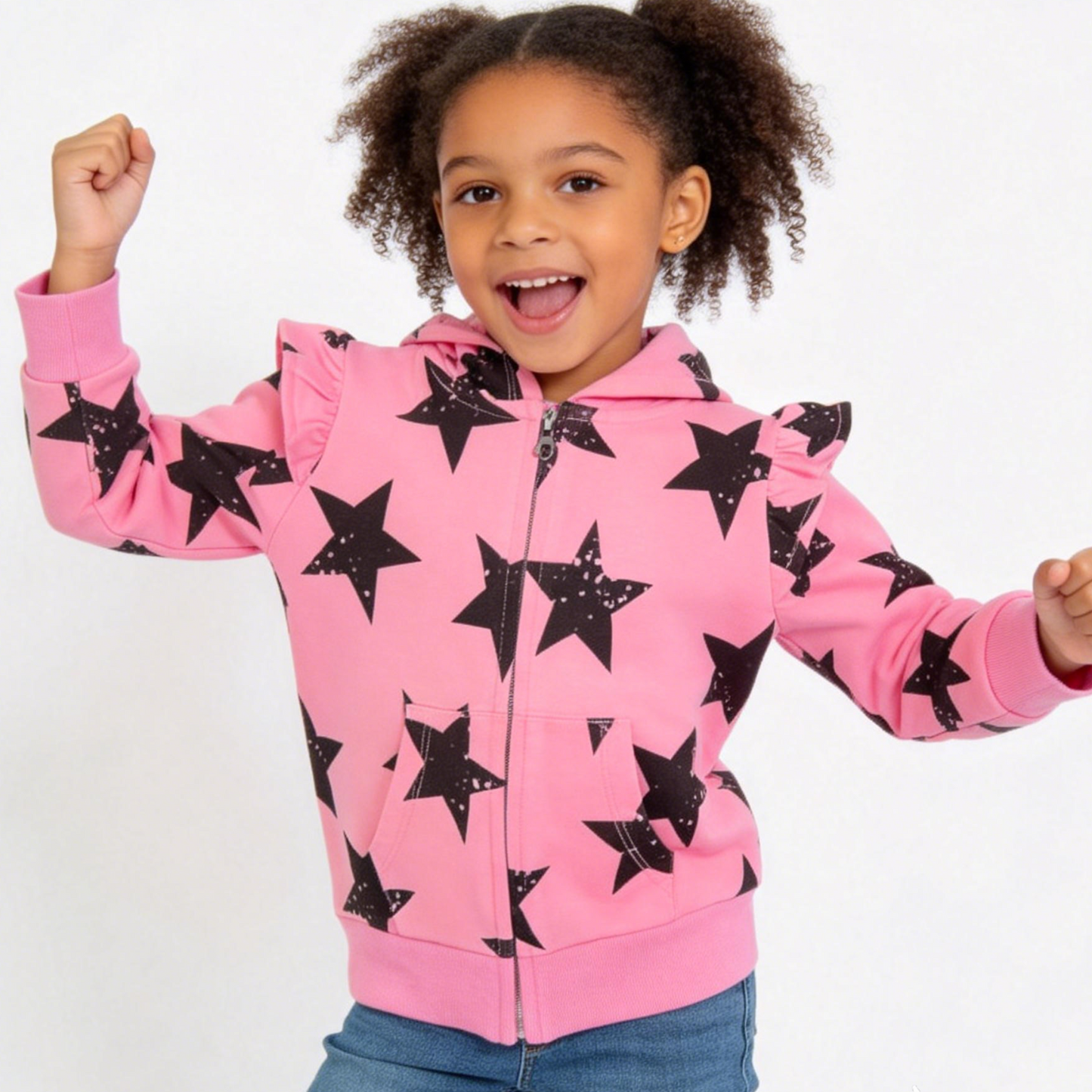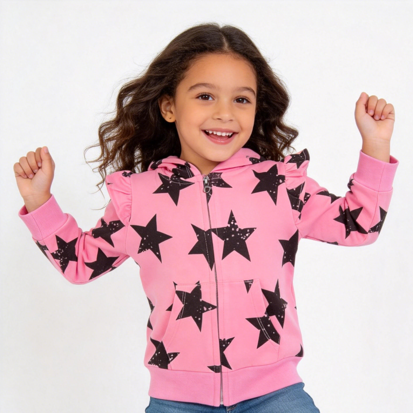 Let your little girl shine bright with our Girls' Pink & Black Star Print Zip-Up Hoodie—a whimsical, playful piece that blends casual comfort with a dash of stardust. The vibrant pink base is covered in a repeating pattern of large black stars (some with subtle speckled details), creating a dynamic, eye-catching look that feels both magical and modern. Delicate ruffle shoulder details add a feminine, design-forward twist, while the attached hood and full-length zipper provide practical warmth and easy dressing—making this hoodie a standout in any playdate or backyard adventure.