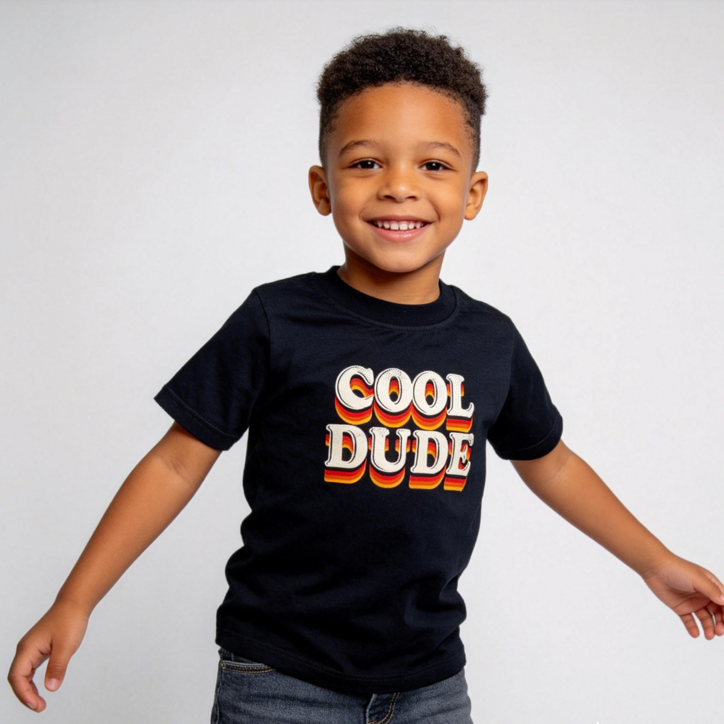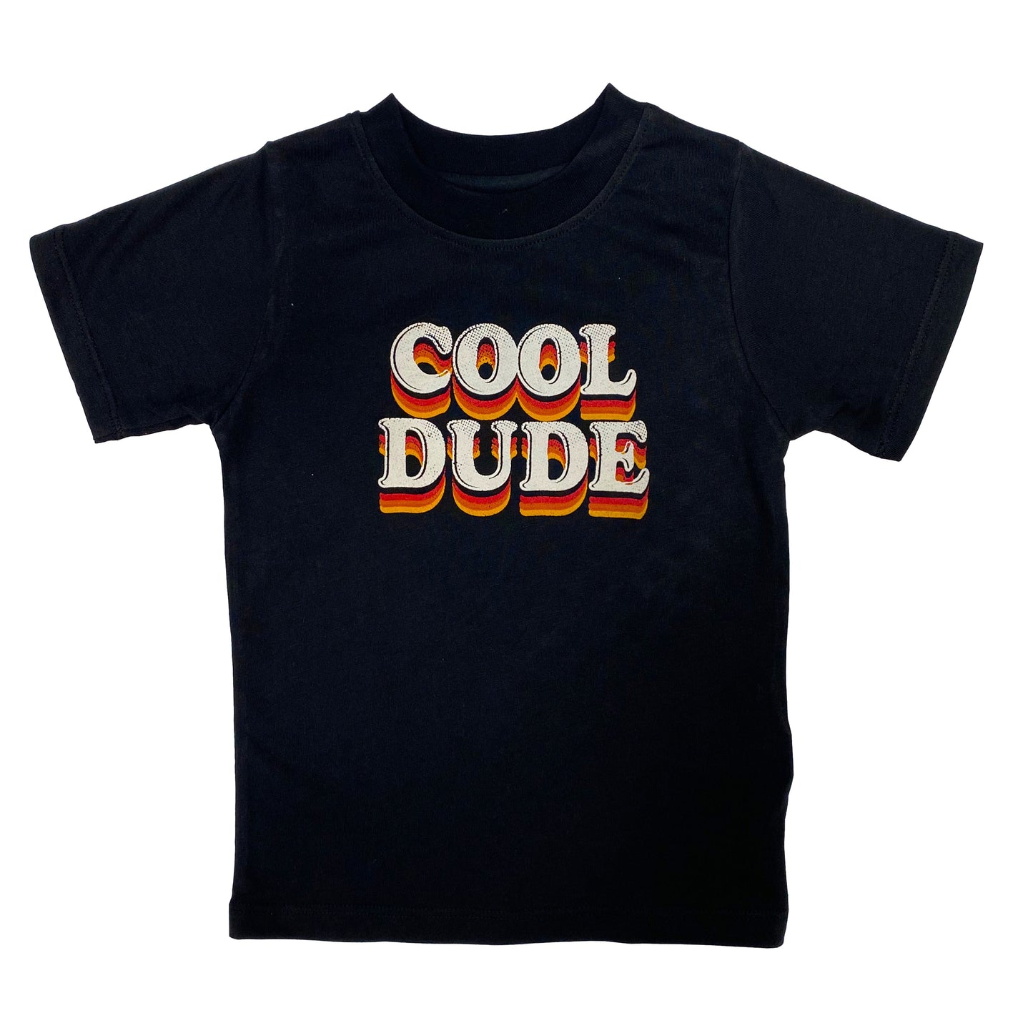 Let your little guy show off his confident, cool side with our Boys' "Cool Dude" Retro Short Sleeve T-Shirt—a bold, nostalgic piece that blends retro style with kid-friendly comfort. The black base features the phrase “COOL DUDE” in a chunky, retro font with a gradient orange-and-red drop shadow, creating a 70s-inspired look that feels both timeless and modern. The classic crew neck and short sleeves provide a simple, casual silhouette—making this tee a standout in any playdate or backyard adventure.